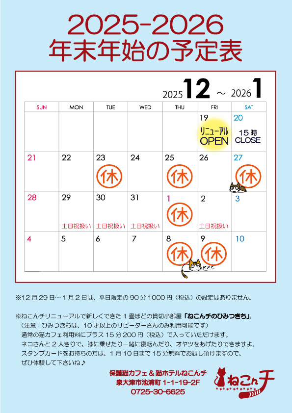 リニューアルオープン2025年12月19日~。ねこんチの奥には「ねこんチのひみつきち」という1畳ほどの小部屋ができました。(注意:ひみつきちはリピーターさんのみ、10才以上から利用可能です。)猫さんと2人きりで膝に乗せたり一緒に寝転んだり、オヤツをあげたりもできますよ。